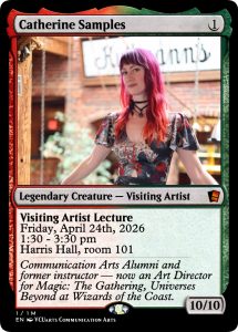 The Department of Communication Arts is proud to host a visiting artist lecture by Communication Arts Alumni, Catherine Samples, an Art Director for Magic: The Gathering, Universes Beyond at Wizards of the Coast! Please join us at Harris Hall (room 101) on Friday, April 24th at 1:30 pm for the lecture.