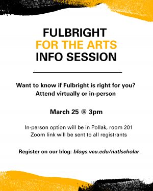 How does spending a year abroad on someone else’s dime sound? The Fulbright U.S. Student Program provides funding to recent graduates and graduate students so that they can spend an academic year in one of 140+ countries across the world carrying out a creative project, conducting research, pursuing postgraduate study, or teaching English. Join VCU’s National Scholarship Office for an information session to learn more about the Fulbright grant, options for arts students and creative scholars, and how our office can help you to apply! Register here to attend (in person or virtually), or to receive the recording.