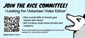 The Richmond Indie Comics Expo (RICE) is still looking for students to join the planning committee, along with a volunteer video editor! We are especially looking for a Treasurer, but there are many roles that allow for students to contribute, even with a heavy workload.