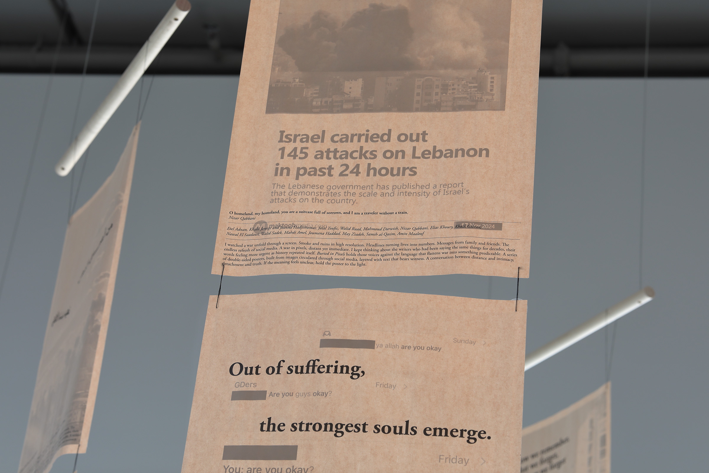 My thesis project interrogates how western media often obscures the realities of middle eastern conflicts. Threads of memory centers around a series of double-sided posters that critique the ways media simplifies complex narratives, specifically human tragedies in the middle east, into numbers and generic headlines. Inspired by the powerful voices of arab writers, this project seeks to reclaim the depth of these narratives, contrasting lived experiences with the often reductive language of western media.