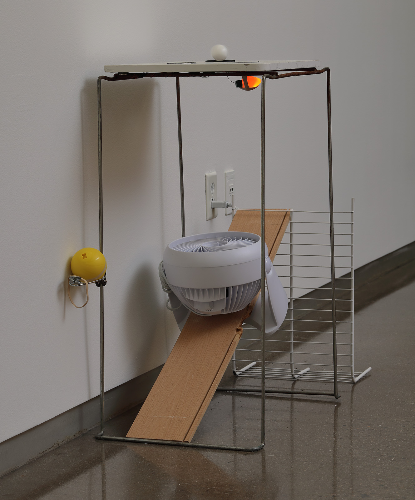 Found and collected objects (laundry hamper stand, laminate from side table, plastic vents, ping pong ball, plastic spoon, holiday lightbulb, laminate from dresser drawer, fan, metal grate, clamp, ring, carabiner), battery powered LED, dog toy, rubber band