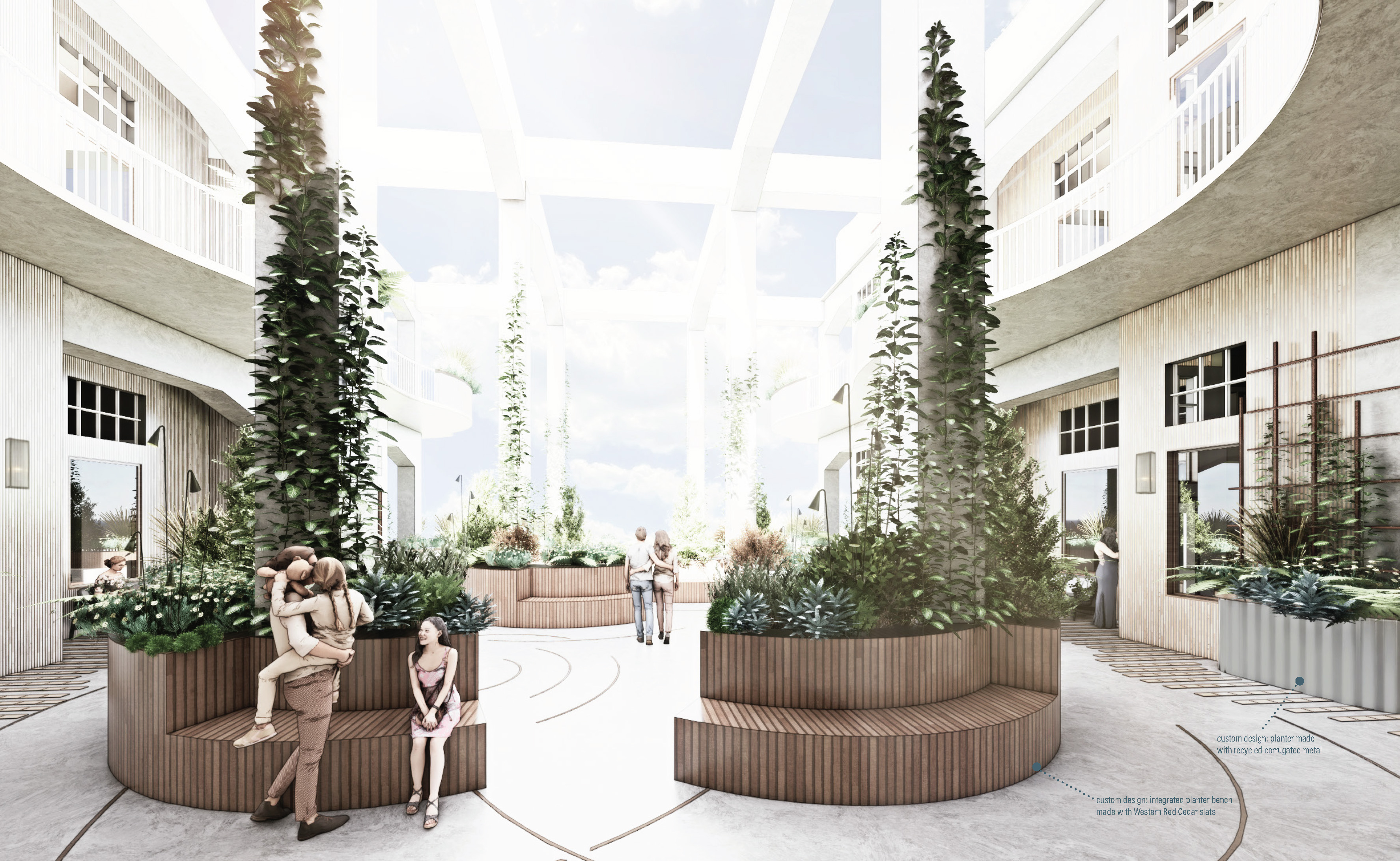 A central courtyard is introduced to the rectangular building to satisfy the primary biophilic design goals of maximising natural light, access and views of nature – providing an outdoor community space, as well as exterior access and bilateral exposure to natural light for each unit.